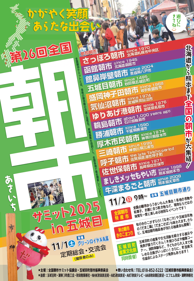 11月1日(土)~2日(日)は、全国朝市サミットや秋の朝市 きのこまつり、五城目町産業文化祭など、楽しいイベントが同時開催します!!