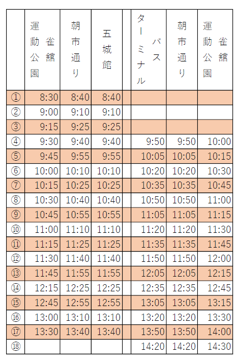 11月2日は雀館運動公園第3駐車場から、朝市通りと五城館まで、無料シャトルバスが運行しますので、ご利用ください!! 駐車場場所 ①五城目朝市駐車場 Googleマップ ②雀館公園第3駐車場 Googleマップ ※五城目朝市大駐車場については、早期に混雑されることが予想されますので、雀館公園第3駐車場のご利用をおすすめいたします。 運行区画 【上り】雀館運動公園第3駐車場→朝市通り(旧長栄堂前)→五城館前 【下り】バスターミナル→朝市通り(旧長栄堂前)→雀館運動公園第3駐車場 運行時刻表